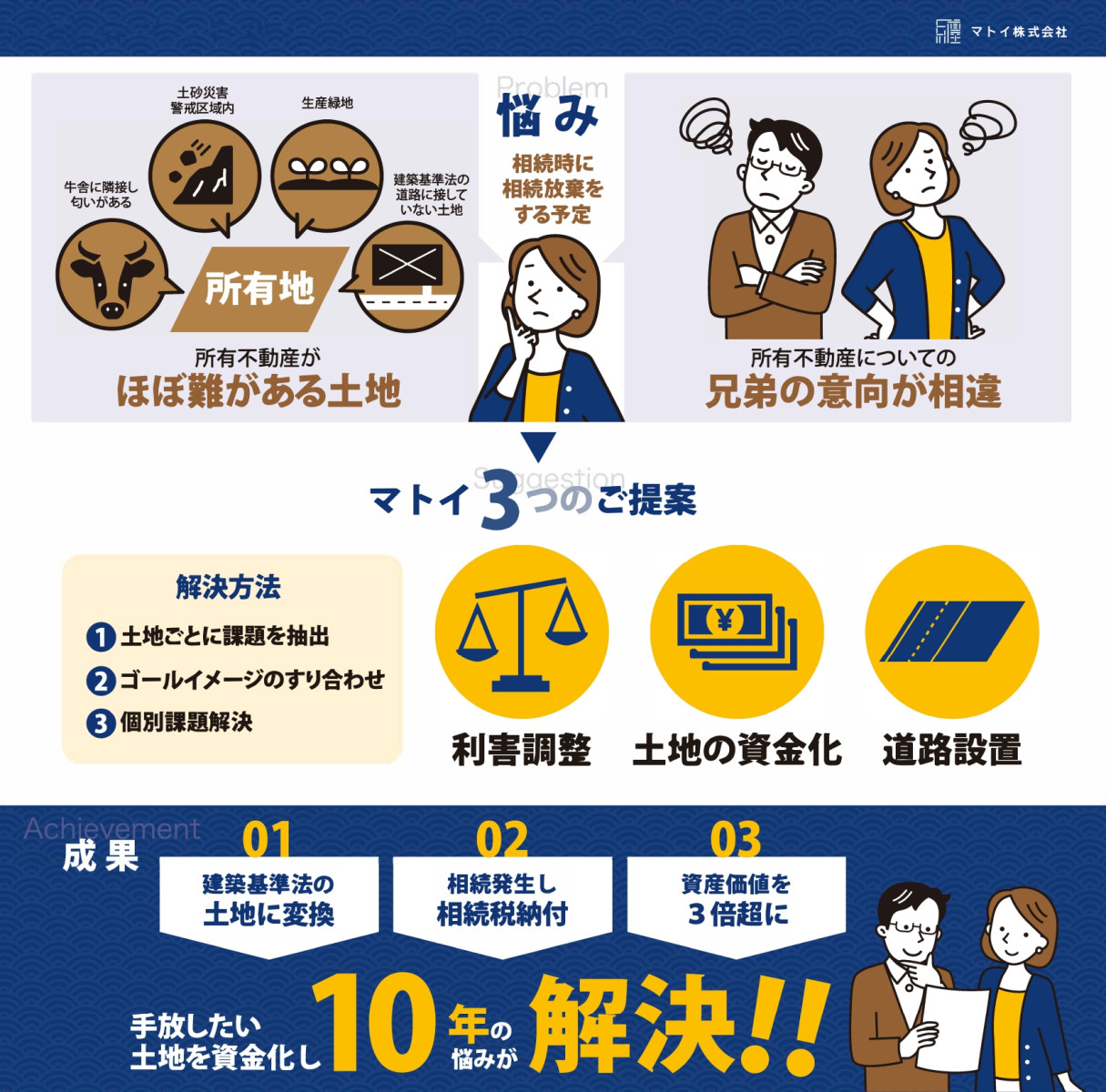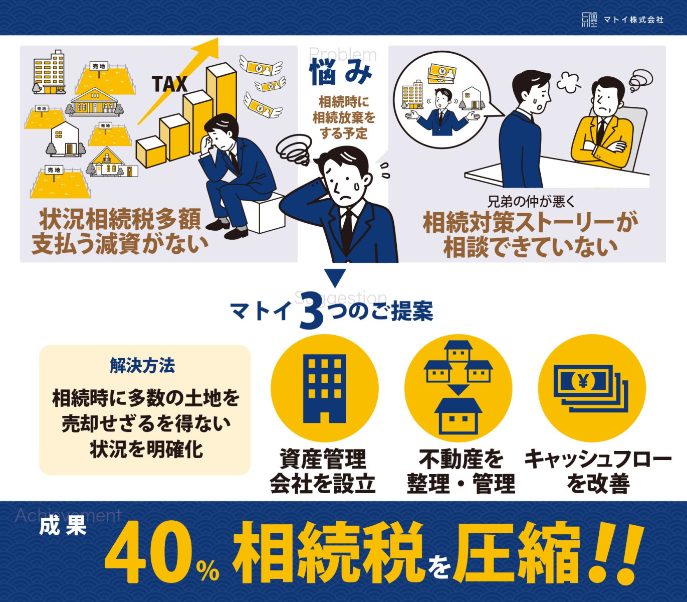 代々続く地主さんでしたが、収益を生まない不動産を多数保有、不動産管理不能状態、相続ストーリー描けておらず次世代にて承継不能となる可能性高いなど様々な問題を抱えていました。